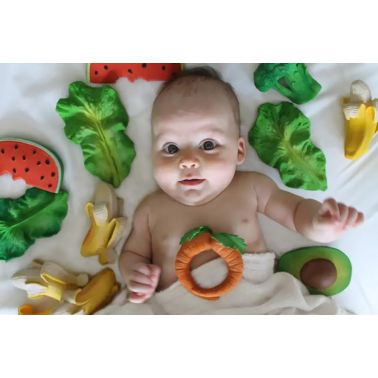 Gryzak Oli and Carol w kształcie pysznego banana, wykonany z naturalnego kauczuku sprawdzi się doskonale w okresie ząbkowania oraz pomoże masować dziąsła oraz jamę ustną wpływając pozytywnie na rozwój integracji sensorycznej dziecka. Banan w kąpieli? – taka zabawka zainspiruje do najbardziej fantastycznych i kreatywnych zabaw!