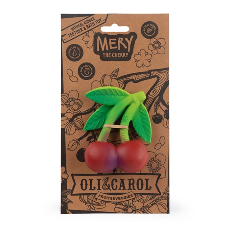 Gryzak Oli and Carol w kształcie pysznych wiśni, wykonany z naturalnego kauczuku sprawdzi się doskonale w okresie ząbkowania oraz pomoże masować dziąsła oraz jamę ustną wpływając pozytywnie na rozwój integracji sensorycznej dziecka. Wiśnie w kąpieli? – taka zabawka zainspiruje do najbardziej fantastycznych i kreatywnych zabaw!