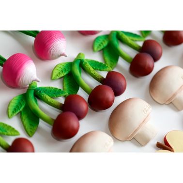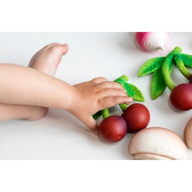 Gryzak Oli and Carol w kształcie pysznych wiśni, wykonany z naturalnego kauczuku sprawdzi się doskonale w okresie ząbkowania oraz pomoże masować dziąsła. W późniejszym etapie posłuży Twojemu dziecku do zabaw tematycznych np. w sklep lub gotowanie.