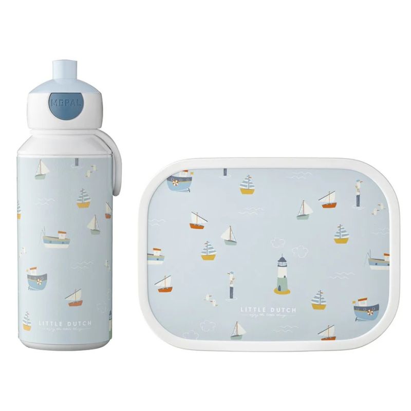 Zestaw Campus marki Mepal składający się z pudełka śniadaniowego i butelki, ozdobiony efektownym, kolorowym nadrukiem.