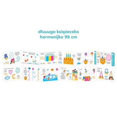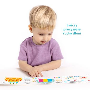 Długa książeczka harmonijka jest pełna kolorowych ilustracji i pomysłów na wesołe paluszkowe zabawy. Na każdej stronie znajdziecie różnorodne zadania, które pozwalają doskonalić gest wskazywania palcem, precyzję ruchów, wspierają rozwój poznawczy oraz umiejętności językowe. Co najmilsze i najważniejsze, dla malucha to po prostu fantastyczna zabawa.
